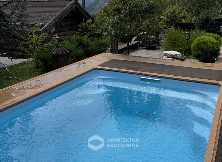 Отделка мозаикой и террасной доской, организована зеленая зона.