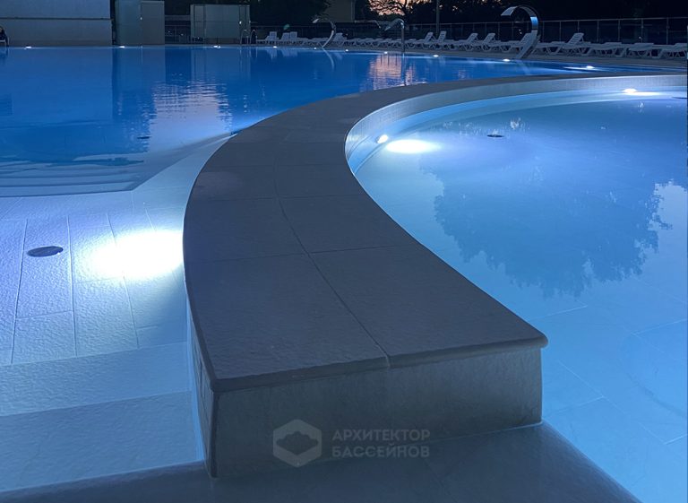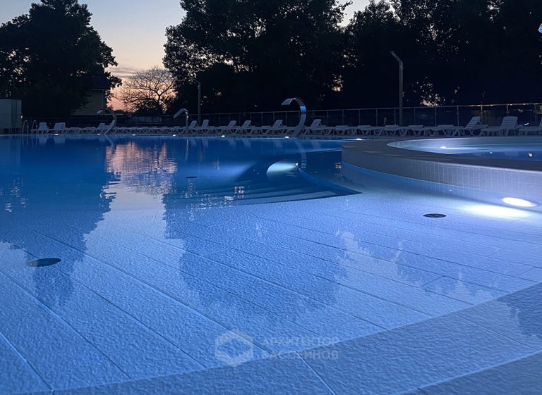 Бассейн бетонный, сложной формы по индивидуальному проекту, облицован плиткой.