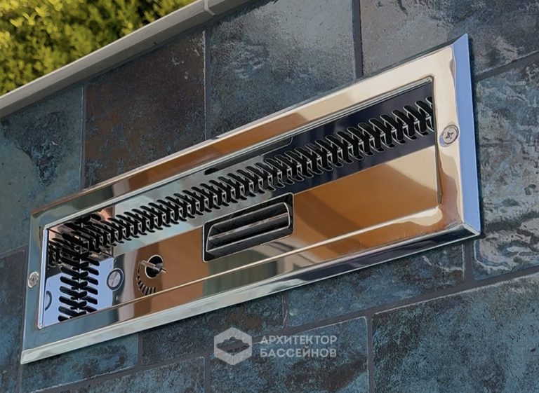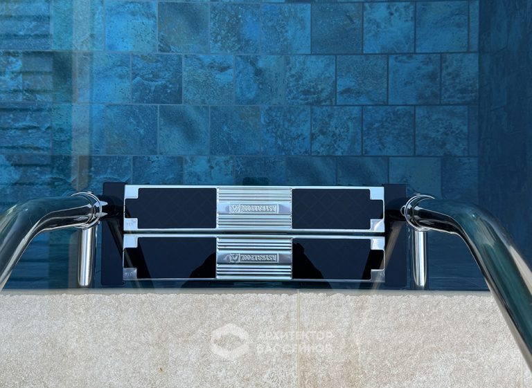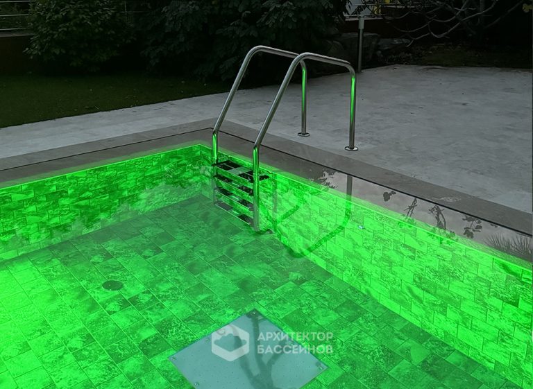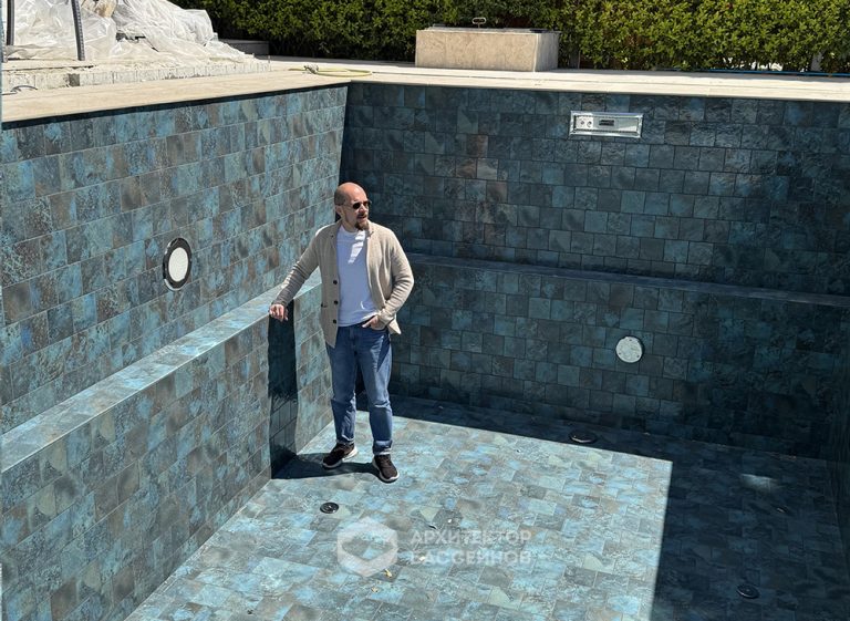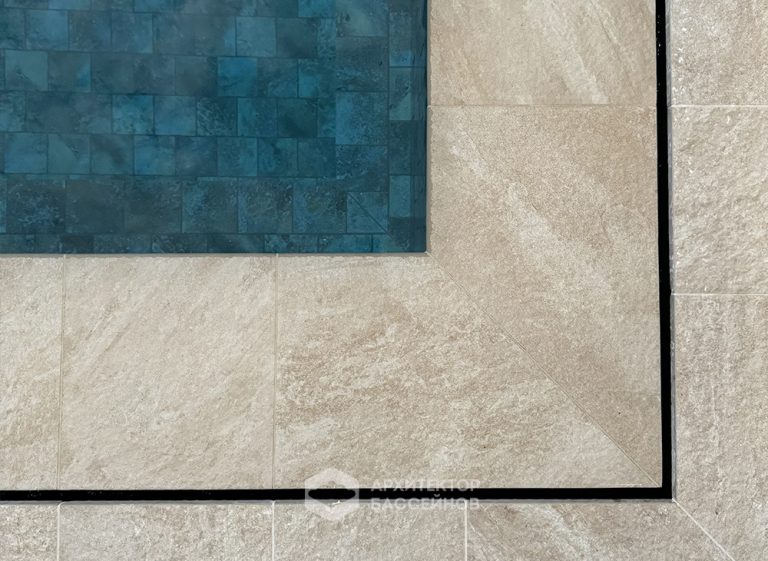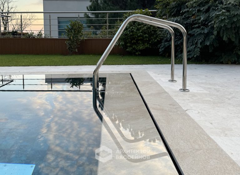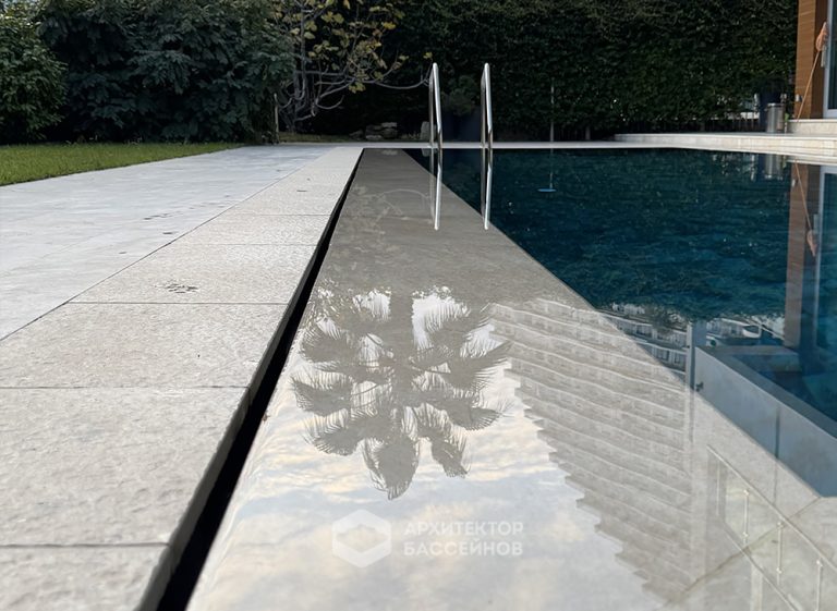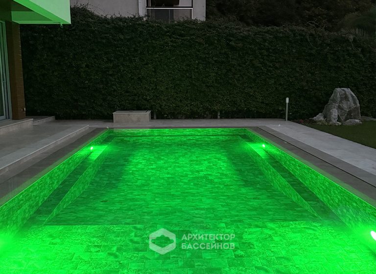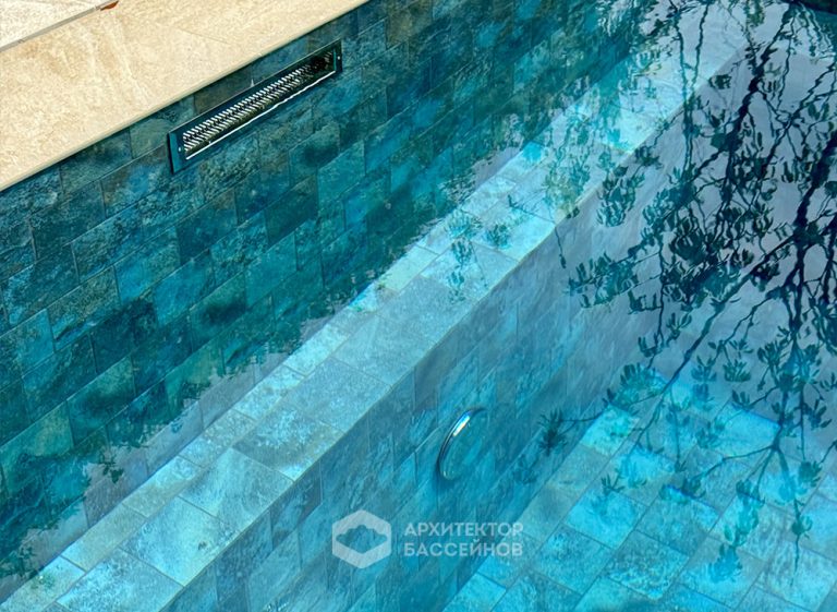 Бассейн бетонный, плавательный переливной, облицован мозаикой.