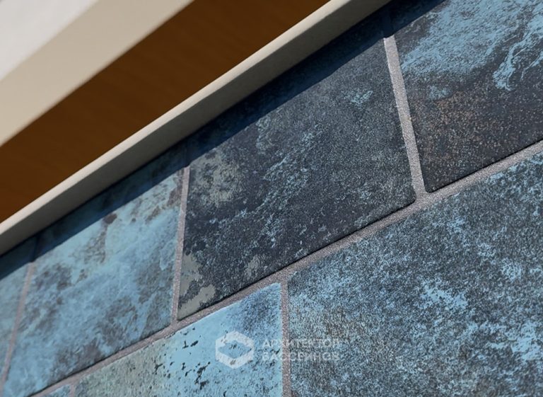 Отделка мозаикой и террасной доской, организована зеленая зона.